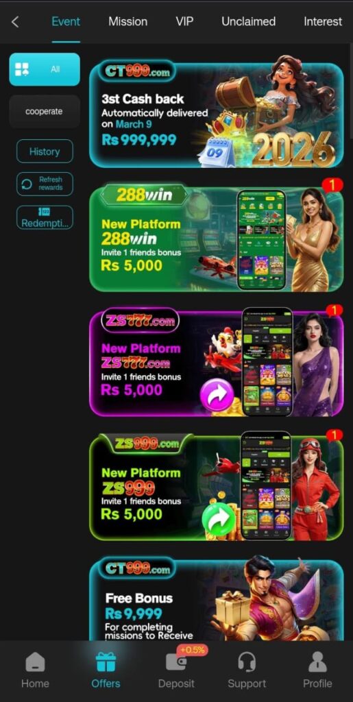 This section updates daily with new offers, events, and bonuses. Users should check it every day to stay updated and enjoy extra benefits.