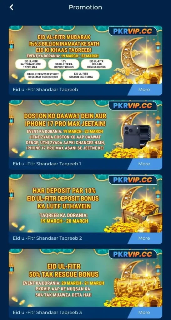 Special offers during Eid, Independence Day, Pakistan Super League season, and other Pakistani events with limited-time enhanced bonuses.